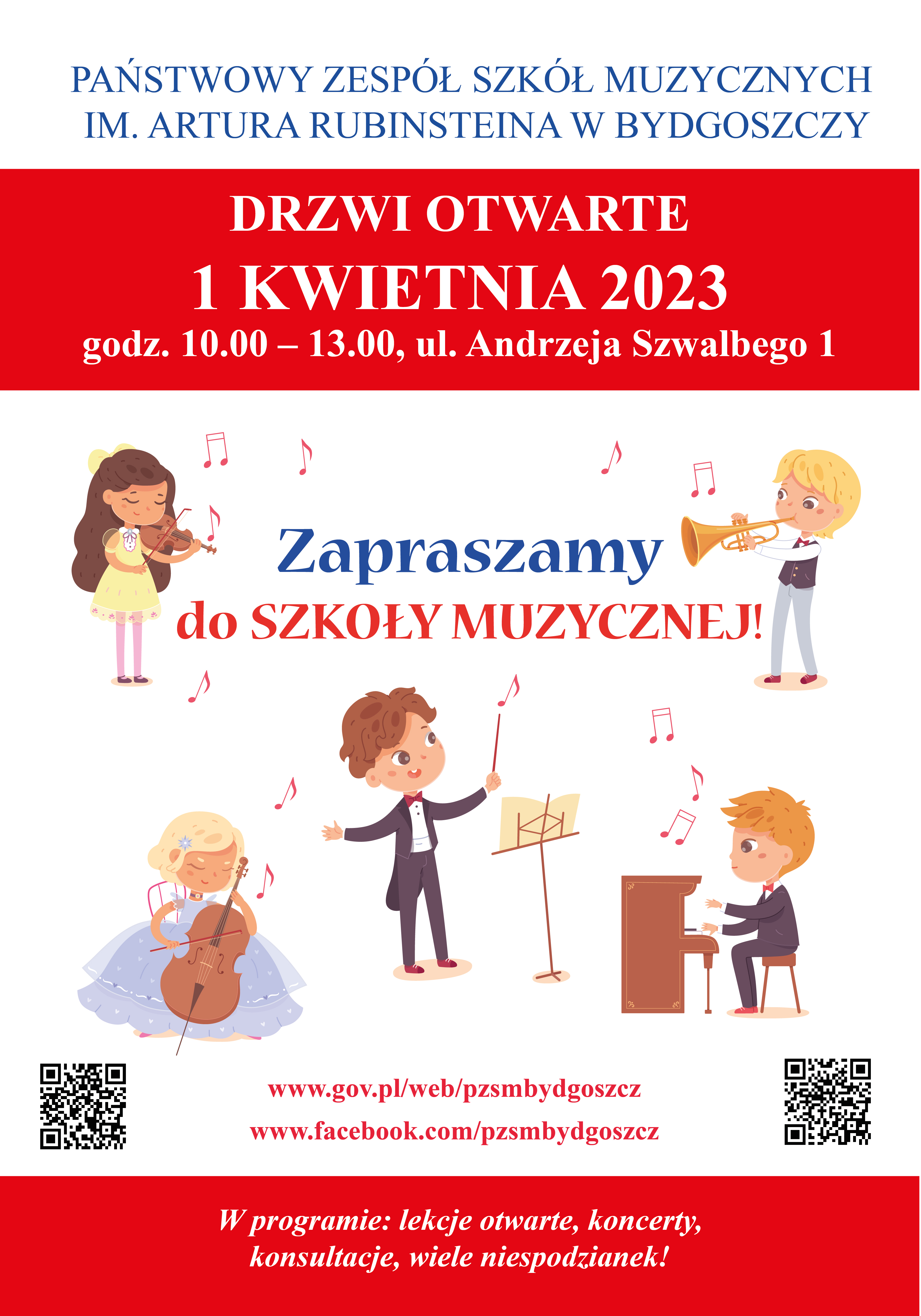 1 kwietnia 2023 roku nasza Szkoła zaprasza na Drzwi Otwarte w godz. od 10.00 do 13.00 (ul. A. Szwalbego 1). W programie koncerty, lekcje otwarte, konsultacje... i wiele niespodzianek!