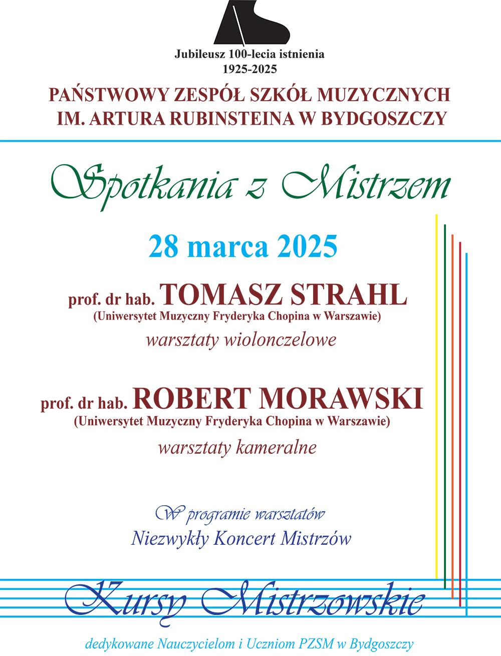 Już w najbliższy piątek 28 marca w naszej Szkole odbędą się kolejne Kursy Mistrzowskie - tym razem wykładowcami będą: Profesor Tomasz Strahl i Profesor Robert Morawski. W trakcie warsztatów Mistrzowie zaprezentują też dzieła muzyki klasycznej na wiolonczelę i fortepian w ramach Niezwykłego Koncertu Mistrzów.