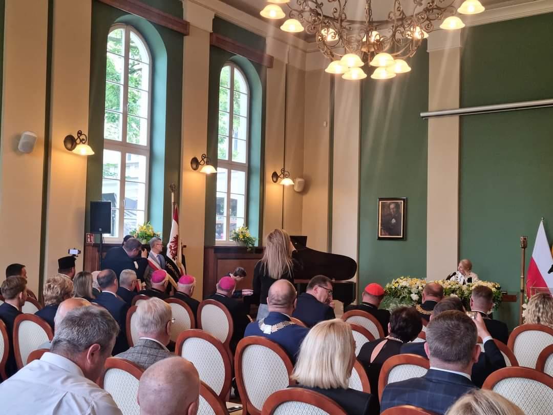 7 czerwca 2024 roku nasi Uczniowie wraz z Panią Dyrektor dr Joanną Derendą-Łukasik i Nauczycielem Panem Sławomirem Opalińskim uczestniczyli na zaproszenie Marszałka Województwa Kujawsko-Pomorskiego - Pana Piotra Całbeckiego oraz Przewodniczącej Sejmiku Województwa Kujawsko-Pomorskiego - Pani Elżbiety Piniewskiej w niezwykle ważnym święcie Województwa Kujawsko-Pomorskiego - uroczystej Sesji Sejmiku Województwa Kujawsko-Pomorskiego. W tym roku sesja odbyła się w Bydgoszczy – w Domu Polskim Centrum Edukacyjno-Formacyjnego Diecezji Bydgoskiej. Jej głównym celem było upamiętnienie ważnych dla naszego regionu i kraju rocznic – 25. rocznicy pielgrzymki Świętego Jana Pawła II na Kujawy i Pomorze, ale także 25-lecia samorządu województwa, wstąpienia Polski do NATO, a także 20. rocznicę wejścia Polski do UE. W sesji wzięli udział radni i liczni zaproszeni goście, m.in. biskup bydgoski Krzysztof Włodarczyk, biskup pomocniczy Diecezji Toruńskiej Józef Szamocki, toruński biskup senior Andrzej Suski – Honorowy Obywatel Województwa Kujawsko-Pomorskiego, dziekan kujawsko-pomorski Diecezji Łódzko-Poznańskiej Polskiego Autokefalicznego Kościoła Prawosławnego ks. Marian Radziwon, posłanka Iwona Karolewska oraz posłowie Norbert Petrykowski i Zbigniew Sosnowski, senator Andrzej Kobiak, poseł do PE Kosma Złotowski, wicewojewoda kujawsko-pomorski Piotr Hemmerling, prezydent Torunia Paweł Gulewski, wiceprezydenci Bydgoszczy Mirosław Kozłowicz i Łukasz Krupa, rektorzy kujawsko-pomorskich wyższych uczelni, przedstawiciele jednostek samorządu terytorialnego, służb mundurowych, stowarzyszeń i organizacji pozarządowych, związków zawodowych, związków harcerskich oraz Urzędu Marszałkowskiego i wojewódzkich jednostek, instytucji i spółek. Gośćmi honorowymi wydarzenia byli kardynał Grzegorz Ryś, arcybiskup metropolita łódzki oraz prezydent Torunia w latach 1998-2002 Wojciech Jerzy Grochowski.