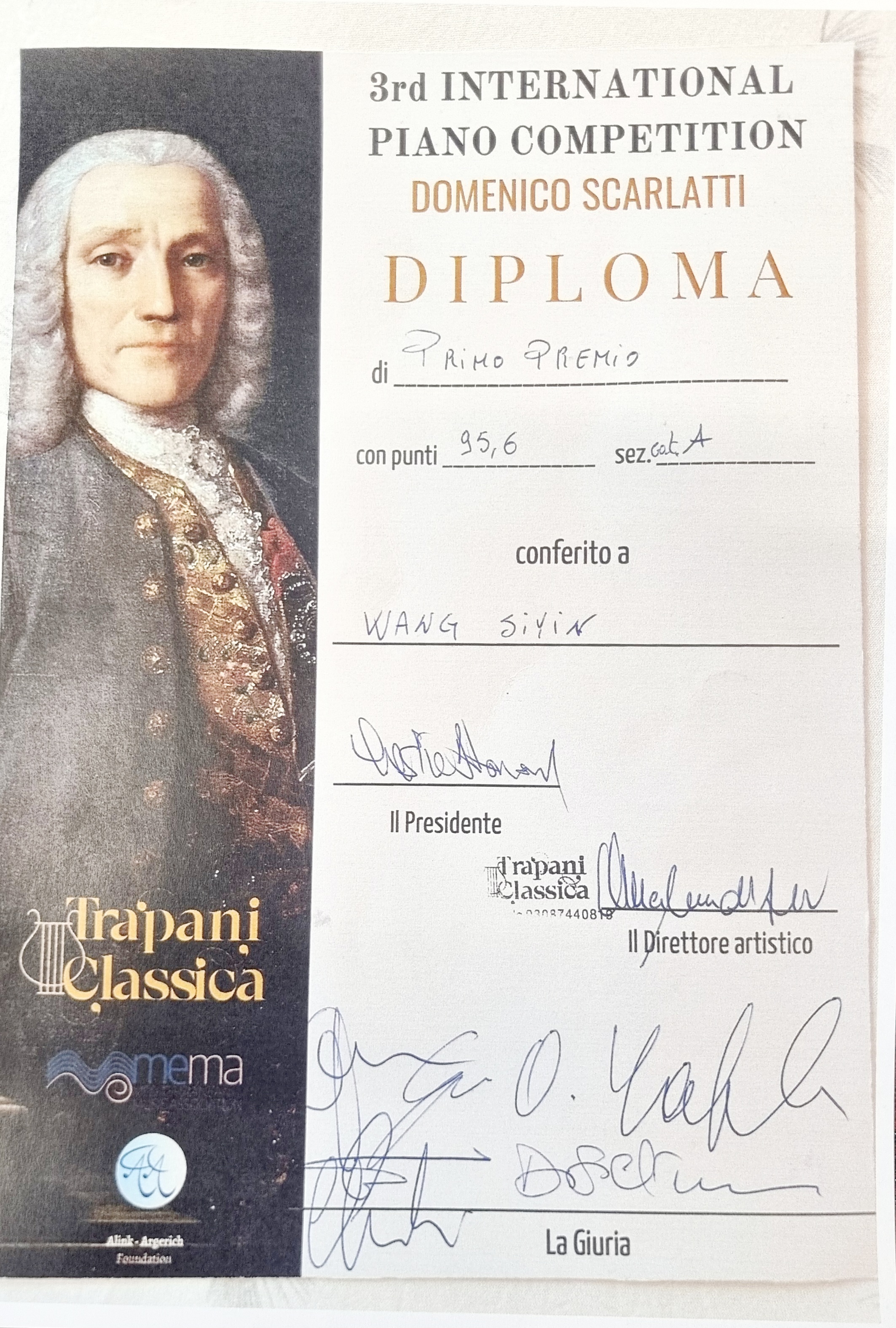 Znakomity sukces naszej Uczennicy Wang Siying z klasy fortepianu Pani Profesor Marii Murawskiej. Gratulujemy I NAGRODY w 3. International Piano Competition Domenico Scarlatti we Włoszech!