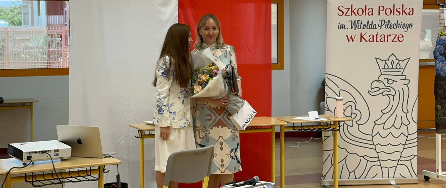 On 30 May 2025, during the end-of-school-year ceremony, the Head of the Embassy of the Republic of Poland in Qatar, Mr Tomasz Sadziński, together with the Consul of the Republic of Poland in Doha, Mr Aleksander Parzych, presented Ms Edyta Gierycz, Director of the Witold Pilecki Polish School in Qatar, with the Honorary Badge of Merit “For Services to the Polish Diaspora and Poles Abroad” awarded by the Polish Prime Minister Mr Donald Tusk.