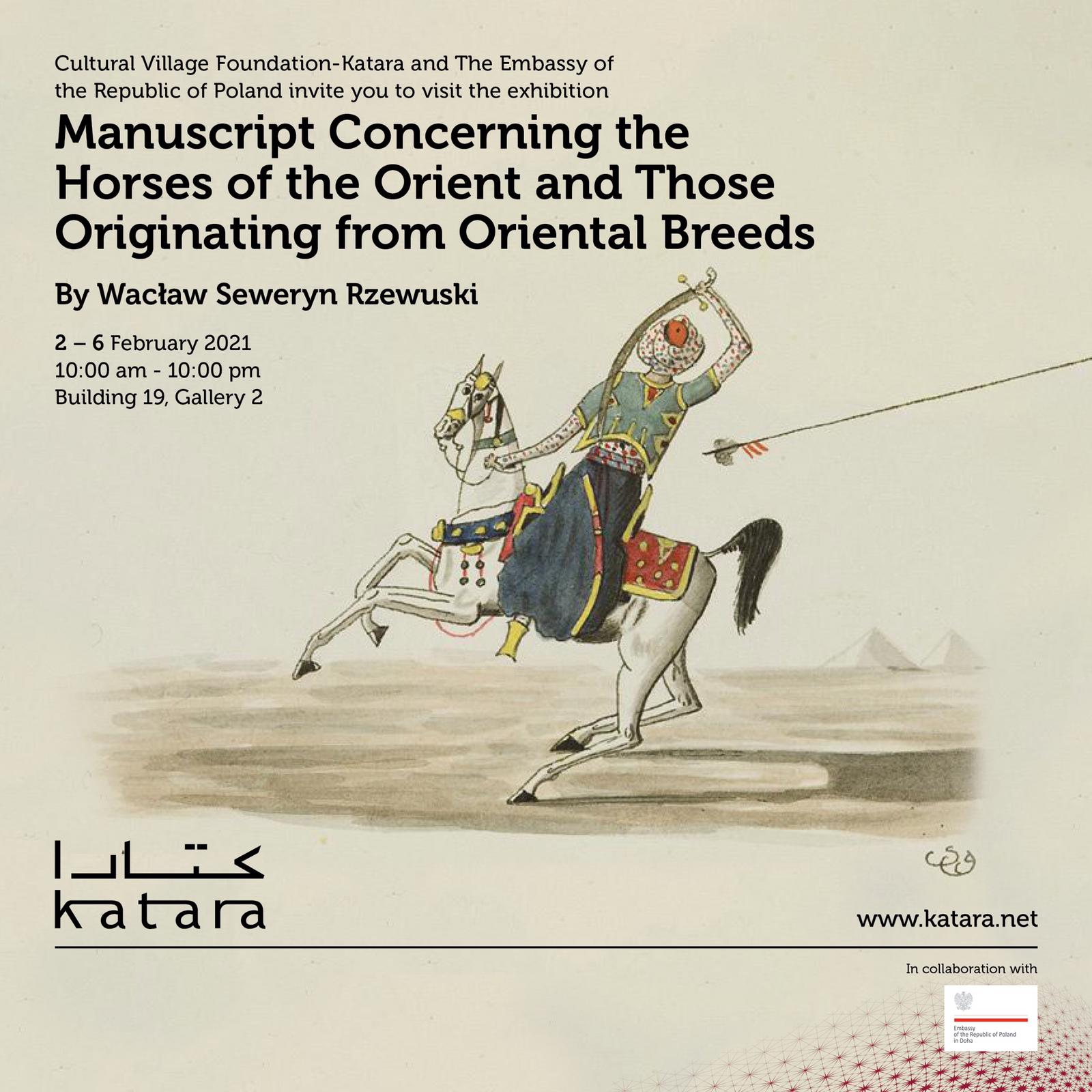 The Embassy of the Republic of Poland, in collaboration with the Cultural Village Foundation – Katara, has organized an exhibition presenting the manuscript “Concerning the Horses of the Orient and Those Originating from Oriental Breeds” written by a Polish enthusiast of the Orient, count Wacław Seweryn Rzewuski. The official opening took place on February 2th, 2021 in the presence of, among others prof. Khalid bin Ibrahim Al Sulaiti, General Manager of the Foundation, Janusz Janke, the Ambassador of the Republic of Poland to the State of Qatar, as well as representatives of Polish community in Qatar. The exhibition is part of the program of the International Arabian Horse Festival 2-6 February 2021.