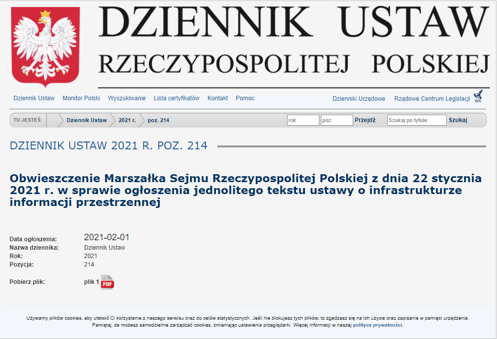 W Dzienniku Ustaw Rzeczypospolitej Polskiej zostało opublikowane obwieszczenie Marszałka Sejmu Rzeczypospolitej Polskiej z 22 stycznia 2021 r. w sprawie ogłoszenia jednolitego tekstu ustawy o infrastrukturze informacji przestrzennej.