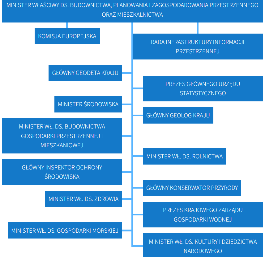 - minister właściwy ds. budownictwa, planowania i zagospodarowania przestrzennego oraz mieszkalnictwa koordynujący tworzenie, utrzymywanie i rozwijanie IIP przy pomocy Głównego Geodety Kraju oraz doradztwie Rady IIP,