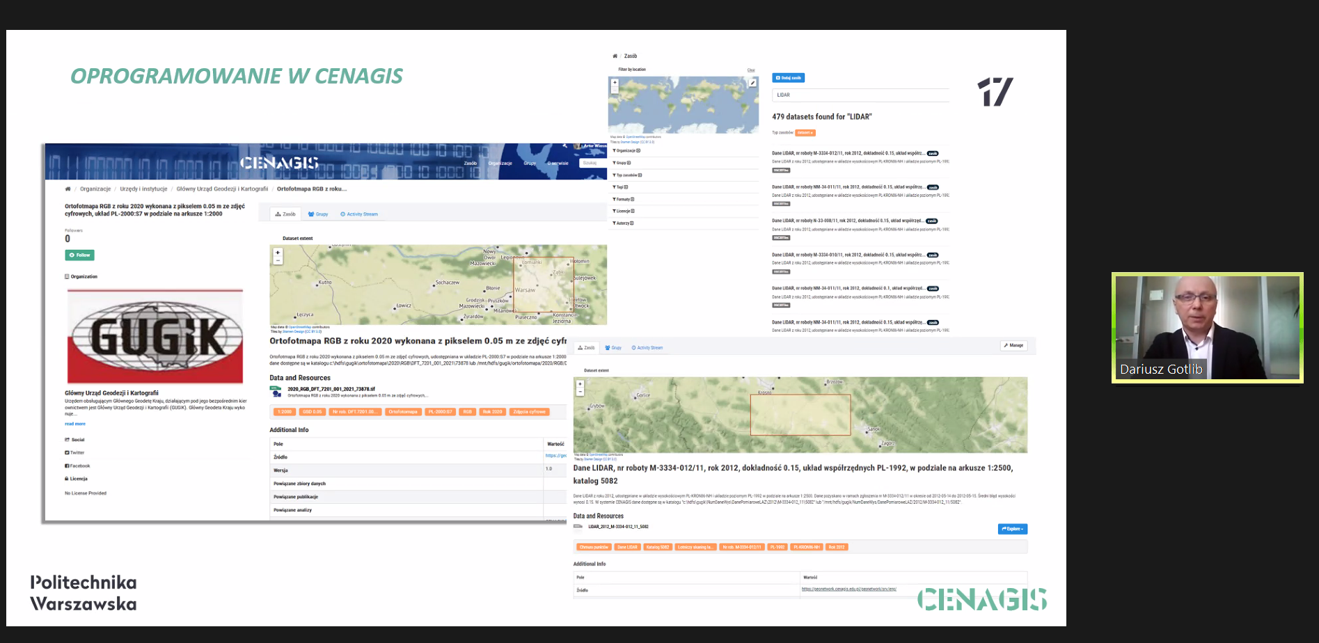 Wiceprzewodniczący Rady dr hab. inż. Dariusz Gotlib, prof. PW mówił o możliwości wykorzystania badawczej infrastruktury CENAGIS w rozwoju krajowej infrastruktury informacji przestrzennej. Wskazał, że główną ideą projektu jest wypracowanie nowych modeli i algorytmów analizy danych do wykorzystania w przemyśle, usługach czy instytucjach publicznych. Infrastruktura CENAGIS jest przeznaczona dla naukowców współpracującymi z wieloma jednostkami badawczymi. Zadaniem badawczym projektu w zakresie infrastruktury informacji przestrzennej jest testowanie nowych koncepcji, architektury IIP i technologii. Wiceprzewodniczący zwrócił uwagę, że już dzisiaj trzeba szukać nowych możliwości do utrzymania na kolejne lata krajowej infrastruktury informacji przestrzennej na wysokim poziomie.