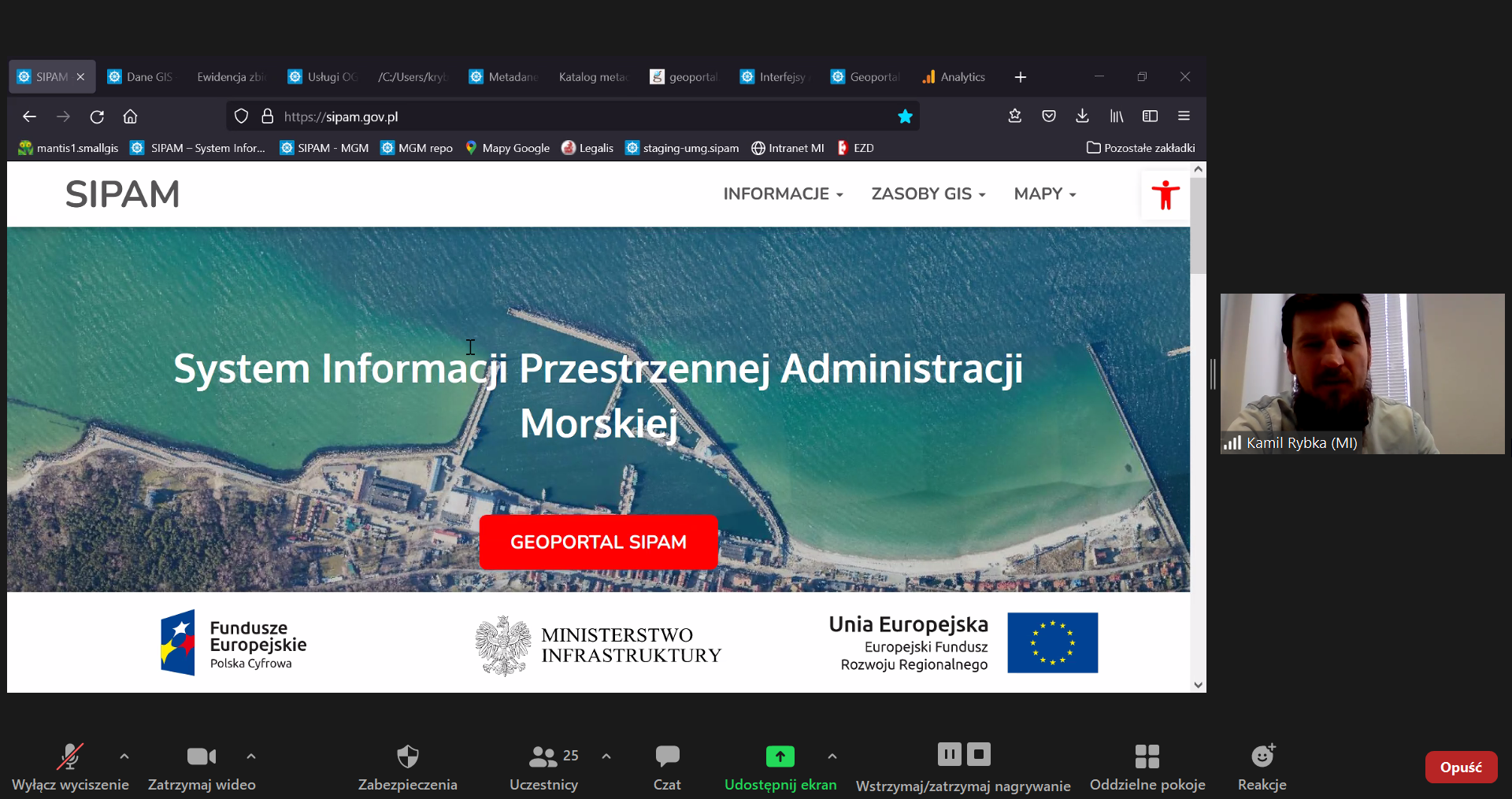 Następnie Kamil Rybka z Departamentu Gospodarki Morskiej, Ministerstwa Infrastruktury zaprezentował możliwości, jakie daje System Informacji Przestrzennej Administracji Morskiej(SIPAM). Wskazał, że dzięki udostępnianym danym w serwisie podniosła się jakość pracy pracowników administracji morskiej dzięki używaniu SIPAM na co dzień przez– m. in. skrócenie czasu potrzebnego na wyszukanie czy dostęp do dokumentów. Dzięki serwisowi SIPAM nawet osoby bez żadnego przygotowania GIS są w stanie tworzyć mapy na potrzeby wydania decyzji np. lokalizacyjnych.