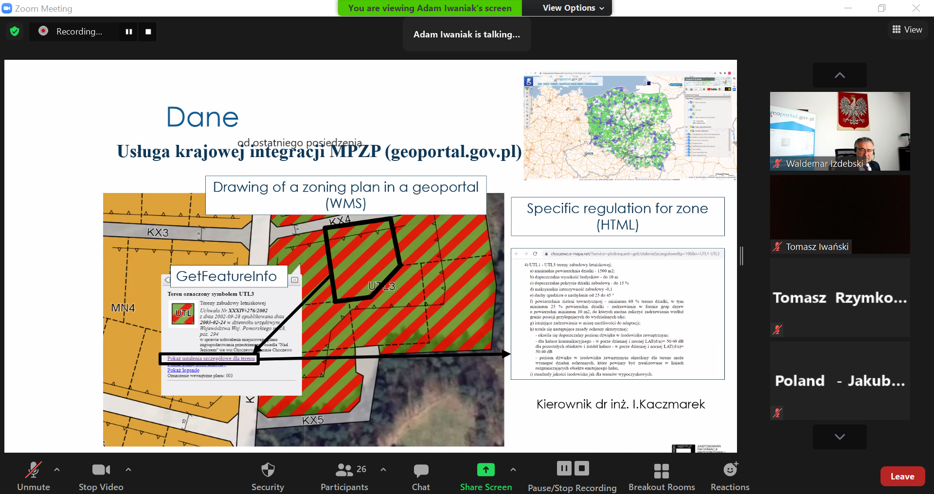 Referat na temat „Infrastruktury informacji przestrzennej w erze sztucznej inteligencji” wygłosił dr hab. inż. Adam Iwaniak, który mówił o tym, że wiek XXI jest okresem wykorzystywania sztucznej inteligencji w gospodarce narodowej i geodezji. Zwrócił uwagę na obszar sztucznej inteligencji związany z przetwarzaniem języka naturalnego oraz uczeniem maszynowym, które mogą być w przyszłości rewolucją. Dodał, że niesie ona ze sobą także pewne zagrożenia dla człowieka związane z utratą pracy czy zagrożenia natury etycznej. Wskazał kilka przykładów wykorzystania: np. z geoportal.gov.pl pobrano dane dotyczące wybranego terenu w MPZP i na podstawie analizy języka naturalnego przyporządkowano do jednej z 9 kategorii (na podstawie planowanej krajowej klasyfikacji przeznaczenia terenu), dzięki czemu otrzymano mapę z jednolitą klasyfikacją przeznaczenia terenu.