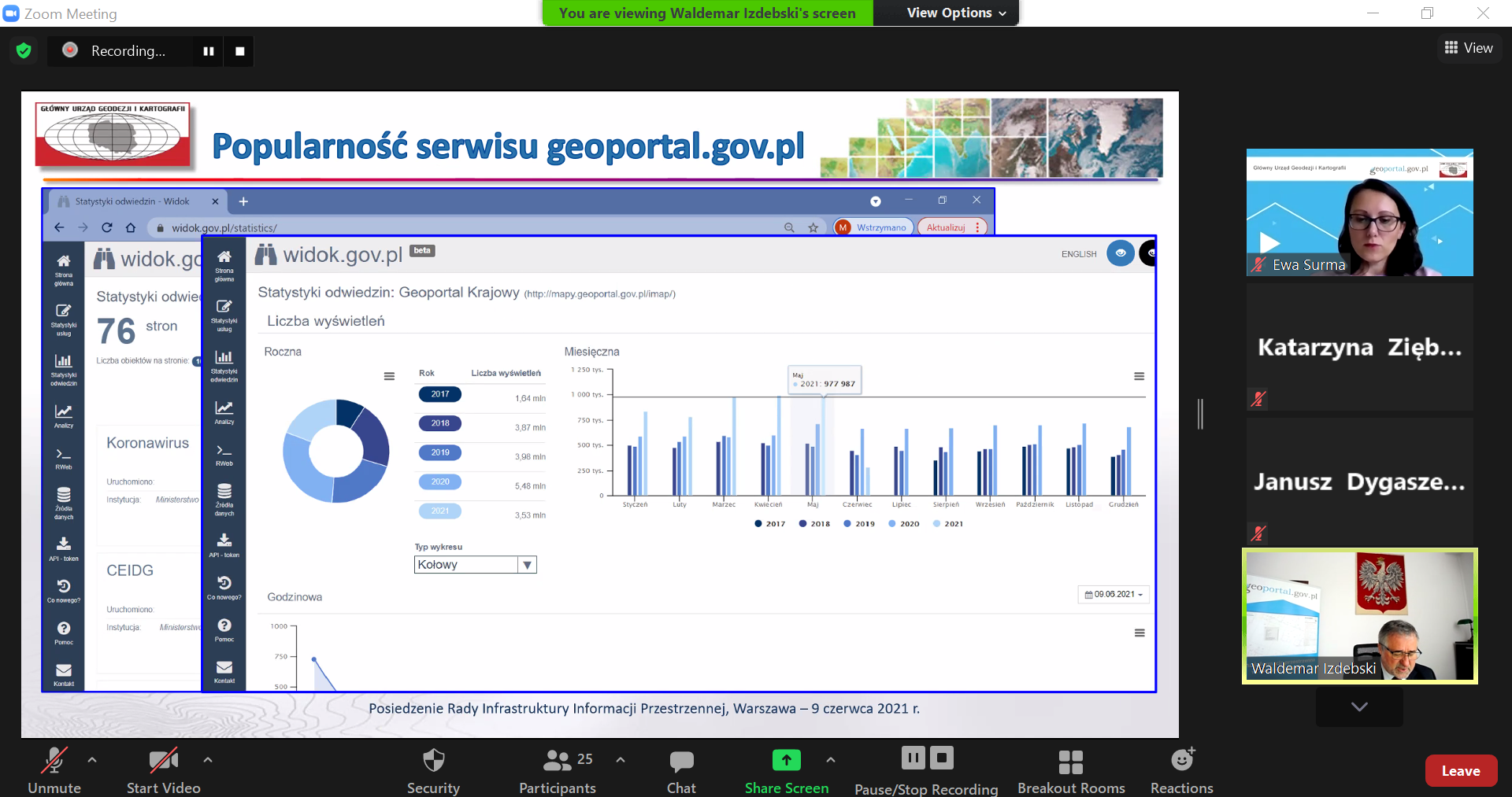 W formie wideokonferencji 9 czerwca 2021 r. odbyło się posiedzenie Rady Infrastruktury Informacji Przestrzennej pod przewodnictwem Głównego Geodety Kraju dr. hab. inż. Waldemara Izdebskiego.
