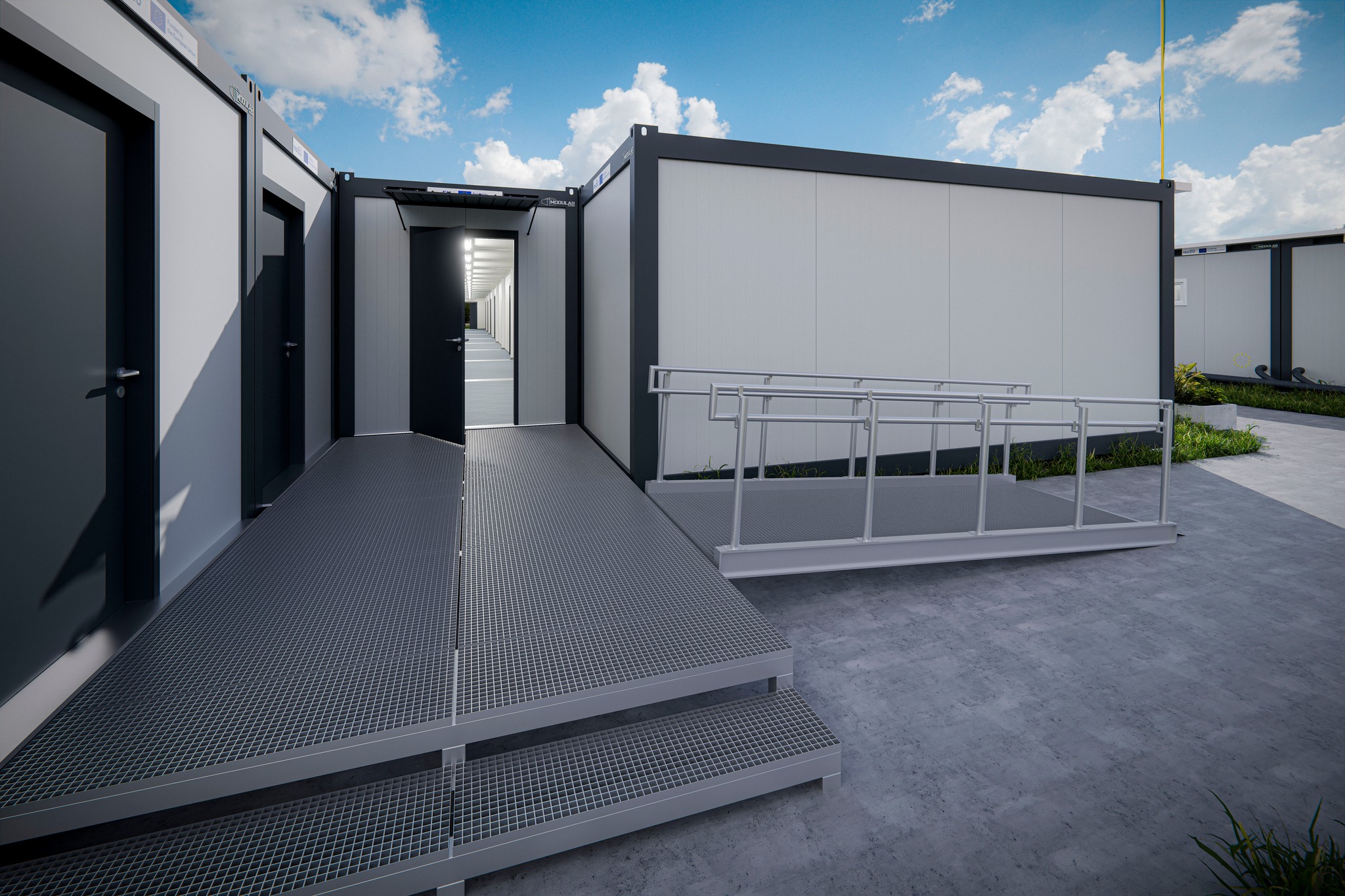 Otrzymaliśmy pierwsze wizualizacje miasteczek kontenerowych, które powstaną w ramach tego projektu, finansowanego ze środków Unii Europejskiej. W sytuacjach kryzysowych zapewnią one możliwie najbardziej komfortowe warunki tymczasowego schronienia – dla maksymalnie 1024 osób, w tym także osób ze szczególnymi potrzebami. Rozwiązania zostały skonsultowane z organizacjami pozarządowymi działającymi na rzecz tych osób. Na wizualizacji widać jedno z miasteczek – zaprojektowane dla 256 osób. W sumie powstanie 6 takich miasteczek, z czego 4 w ramach obecnego zamówienia. Ich realizacja zakończy się w sierpniu bieżącego roku.