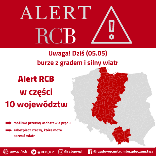 „Uwaga! Dziś (05.05) możliwe gwałtowne burze z gradem i silny wiatr. Zachowaj ostrożność i zabezpiecz rzeczy, które może porwać wiatr”.