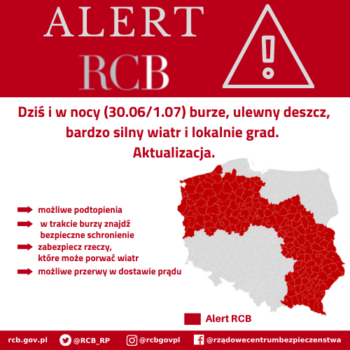 Aktualizacja. Uwaga! Dziś i w nocy (30.06/1.07) burze, ulewny deszcz, bardzo silny wiatr i lokalnie grad. Zabezpiecz rzeczy, które może porwać wiatr. Możliwe podtopienia. - Alert RCB o takiej treści został dziś rozesłany do osób przebywających na terenie dziesięciu województw.
