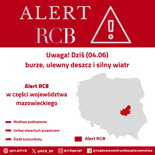 Alert RCB - burze, ulewny deszcz i silny wiatr (04.06)