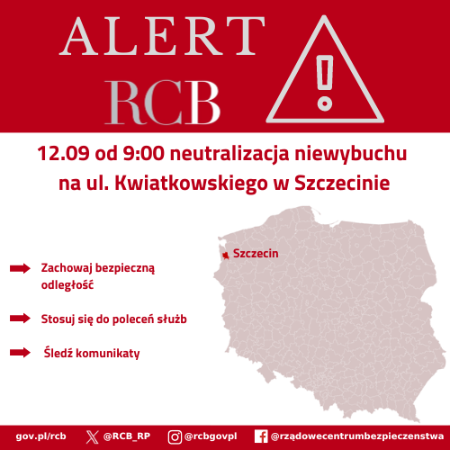 "Uwaga! 12.09 od 9:00 neutralizacja niewybuchu na ul. Kwiatkowskiego w Szczecinie. Zachowaj bezpieczną odległość i stosuj się do poleceń służb. Śledź komunikaty."