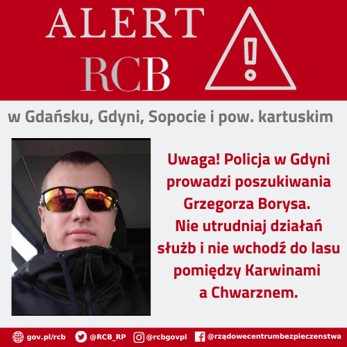 "Uwaga! Policja w Gdyni prowadzi poszukiwania Grzegorza Borysa. Nie utrudniaj dzialan słuzb i nie wchodz do lasu pomiedzy Karwinami a Chwarznem."