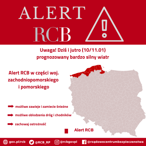 „Uwaga! Dziś i jutro (10/11.01) prognozowany bardzo silny wiatr. Możliwe zawieje i zamiecie śnieżne oraz oblodzenie dróg. Zachowaj ostrożność."