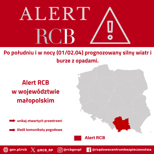 "UWAGA! Dziś po południu i w nocy (01/02.04) prognozowany silny wiatr i burze z opadami. Możliwe wyłączenia prądu. Unikaj otwartych przestrzeni". SMS z ostrzeżeniem został wysłany do odbiorców na terenie województwa małopolskiego.
