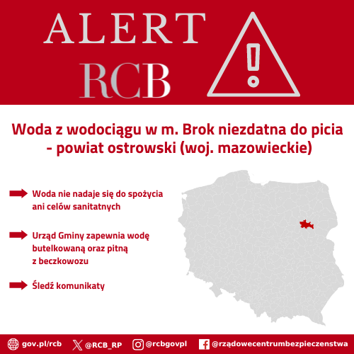 Alert RCB - woda z wodociągu w m. Brok niezdatna do picia (woj. mazowieckie)
