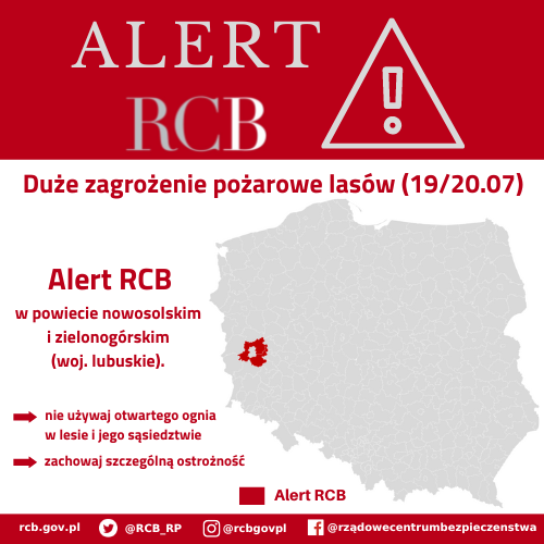 "Uwaga, dziś i jutro (19/20.07) duże zagrożenie pożarowe lasów. Zachowaj ostrożność i nie używaj otwartego ognia w lesie i jego sąsiedztwie." Alert RCB został wysłany do mieszkańców powiatów nowosolskiego i zielonogórskiego (woj. lubuskie).
