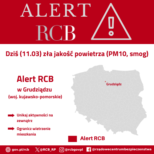 Uwaga! Dziś (11.03) zła jakość powietrza (PM10, smog). Unikaj aktywności na zewnątrz i wietrzenia mieszkania. Alert RCB został wysłany do odbiorców w Grudziądzu (województwo kujawsko-pomorskie).