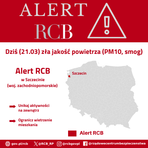 Uwaga! Uwaga! Dziś (21.03) zła jakość powietrza (PM10, smog). Unikaj aktywności na zewnątrz i wietrzenia mieszkania. Alert RCB został wysłany do odbiorców w Szczecinie (województwo zachodniopomorskie).