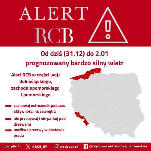 „Uwaga! Od dziś (31.12) do 2.01 prognozowany bardzo silny wiatr. Zachowaj ostrożność podczas aktywności na zewnątrz, nie przebywaj i nie parkuj pod drzewami”. SMS z ostrzeżeniem – Alert RCB został wysłany do części odbiorców w województwach: dolnośląskim, zachodniopomorskim i pomorskim. Instytut Meteorologii i Gospodarki Wodnej prognozuje porywy wiatru do 115 km/h.