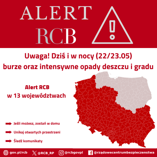 W związku z prognozowanymi przez IMGW burzami (ostrzeżenia 1. i 2. stopnia), został uruchomiony Alert RCB. SMS o treści: „Uwaga! Dziś i w nocy (22/23.05) lokalnie możliwe burze oraz intensywne opady deszczu i gradu. Jeśli możesz, zostań w domu. Unikaj otwartych przestrzeni” został wysłany do odbiorców w 13 województwach.