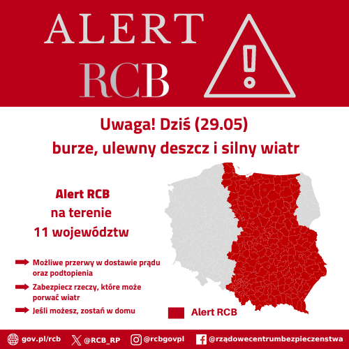 „Uwaga! Dziś (29.05) prawdopodobne burze, ulewny deszcz i silny wiatr. Możliwe podtopienia. W trakcie burzy znajdź bezpieczne schronienie.” W związku z prognozami IMGW, dotyczącymi możliwości wystąpienia burz z bardzo silnymi opadami deszczu, w 11 województwach został uruchomiony Alert RCB.