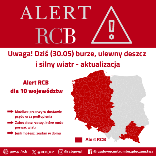 "Uwaga! Dziś (30.05) prawdopodobne burze, ulewny deszcz i silny wiatr. Możliwe podtopienia. W trakcie burzy znajdź bezpieczne schronienie."