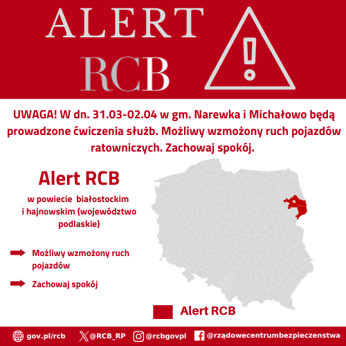 „UWAGA! W dn. 31.03-02.04 w gm. Narewka i Michałowo będą prowadzone ćwiczenia służb. Możliwy wzmożony ruch pojazdów ratowniczych. Zachowaj spokój”. Alert RCB został wysłany do odbiorców w powiecie białostockim i hajnowskim, województwo podlaskie.