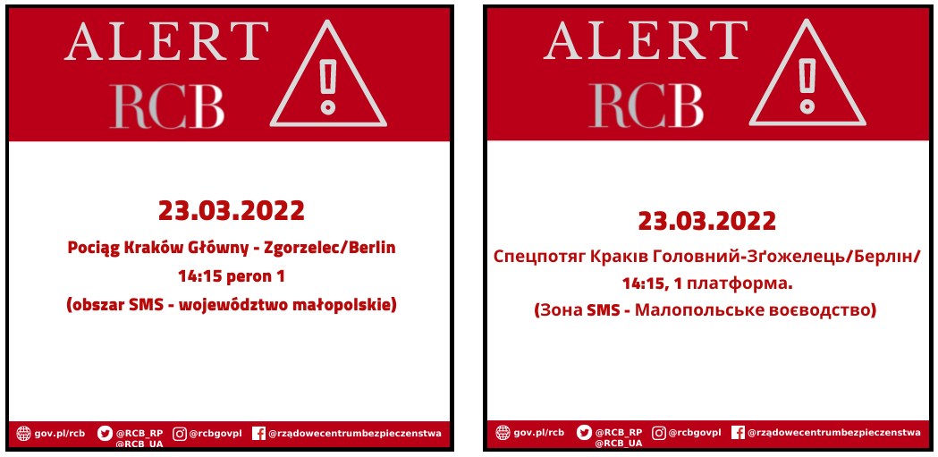 Alert RCB został wysłany do osób posiadających ukraińskie karty SIM, których telefony logują się do polskich sieci komórkowych, w związku z planowanymi pociągami specjalnymi. SMS został wysłany w języku ukraińskim.