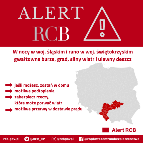 Aktualizacja. Do mieszkańców Śląska, Dolnego Śląska, woj. opolskiego, łódzkiego i części powiatów województwa świętokrzyskiego i wielkopolskiego zostały wysłane Alerty RCB z ostrzeżeniem przed gwałtownymi burzami, silnym wiatrem i ulewnym deszczem.