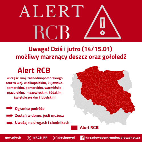 Alert RCB - marznący deszcz oraz gołoledź (14/15.01)