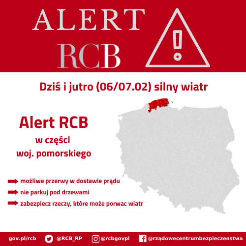 „Uwaga! Dziś i jutro (06/07.02) prognozowany silny wiatr. Możliwe przerwy w dostawie prądu. Zabezpiecz rzeczy, które możne porwać wiatr”. SMS z ostrzeżeniem został wysłany do mieszkańców pięciu powiatów województwa pomorskiego – powiaty: słupski, Słupsk, lęborski, wejherowski, pucki.