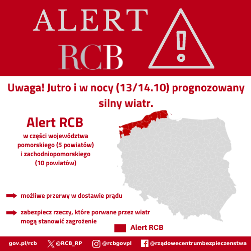 „Jutro i w nocy (13/14.10) prognozowany silny wiatr. Możliwe przerwy w dostawie prądu. Zabezpiecz rzeczy, które porwane przez wiatr mogą stanowić zagrożenie.” Alert RCB o takiej treści został wysłany do odbiorców w części województwa pomorskiego i zachodniopomorskiego.