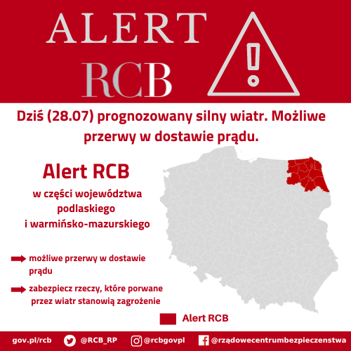 W związku z ostrzeżeniami Instytutu Meteorologii i Gospodarki Wodnej dotyczącymi silnego wiatru, do odbiorców w części województwa podlaskiego i warmińsko-mazurskiego wysłano Alert RCB o treści: „Uwaga! Dziś (28.07) prognozowany silny wiatr. Możliwe przerwy w dostawie prądu. Unikaj otwartych przestrzeni” .