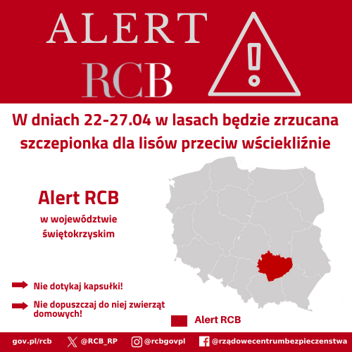 W związku z akcją szczepień lisów przeciwko wściekliźnie na terenie woj. świętokrzyskiego wysłano ALERT RCB o treści: „Uwaga! W dn. 22-27.04 w lasach będzie zrzucana szczepionka dla lisów przeciw wściekliźnie. Nie dotykaj kapsułki i nie dopuszczaj do niej zwierząt domowych!”.