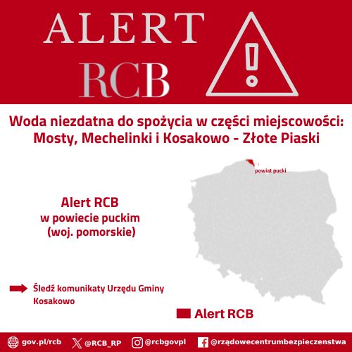 Alert RCB - woda niezdatna do spożycia w części miejscowości: Mosty, Mechelinki i Kosakowo - Złote Piaski (woj. pomorskie)