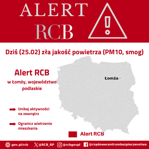 Uwaga! Dziś (25.02) zła jakość powietrza (PM10, smog). Unikaj aktywności na zewnątrz i wietrzenia mieszkania. Alert RCB został wysłany do odbiorców w Łomży (województwo podlaskie).