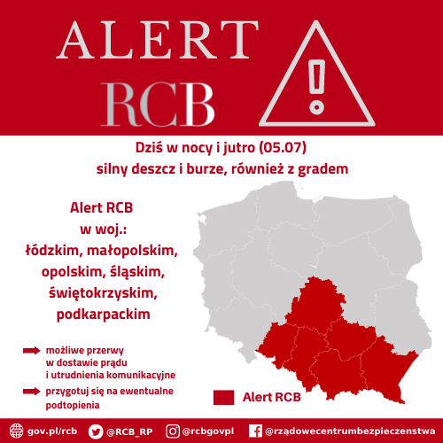 „Uwaga! Dziś w nocy i jutro (05.07) silny deszcz i burze, również z gradem. Możliwe przerwy w dostawie prądu. Zachowaj ostrożność.” Alert RCB został wysłany do mieszkańców województw: łódzkiego, małopolskiego, opolskiego, śląskiego, świętokrzyskiego i podkarpackiego.