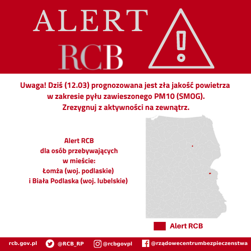 Alert RCB, w związku ze złą jakością powietrza, został wysłany do użytkowników telefonów komórkowych w Łomży (województwo podlaskie) oraz Białej Podlaski (województwo lubelskie). Główny Inspektorat Ochrony Środowiska prognozuje zagrożenie przekroczenia średniodobowego stężenia pyłu zawieszonego PM10 powyżej 150 µg/m3.