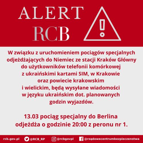 Do osób posiadających ukraińskie karty SIM przebywających na terenie Krakowa, powiatu krakowskiego i wielickiego wysłano Alert RCB, w języku ukraińskim, w związku z planowanymi pociągami specjalnymi do Niemiec.