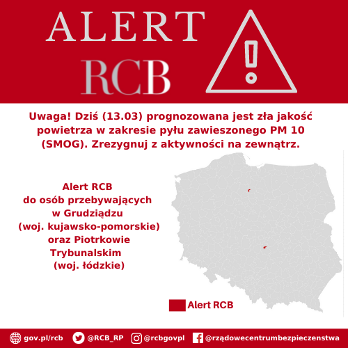 Alert RCB, w związku ze złą jakością powietrza, został wysłany do użytkowników telefonów komórkowych w Grudziądzu (woj. kujawsko-pomorskie) i Piotrkowie Trybunalskim (woj. łódzkie) oraz Białej Podlaski (województwo lubelskie). Główny Inspektorat Ochrony Środowiska prognozuje zagrożenie przekroczenia średniodobowego stężenia pyłu zawieszonego PM10 powyżej 150 µg/m3.