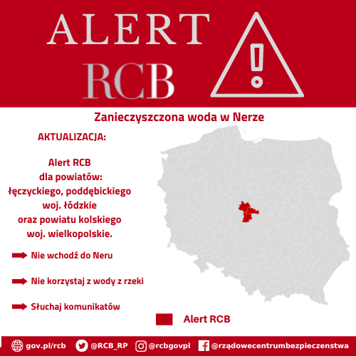 AKTUALIZACJA: W związku z zagrożeniem ekologicznym na rzece Ner, do użytkowników sieci telefonii komórkowych na terenie województwa łódzkiego (powiaty: poddębicki i łowicki) oraz województwa wielkopolskiego (powiat kolski) wysłano wiadomość o treści: Uwaga! Zanieczyszczona woda w Nerze. Nie wchodź do wody i nie korzystaj z niej. Nie jedz i nie łów ryb. Śledź komunikaty.