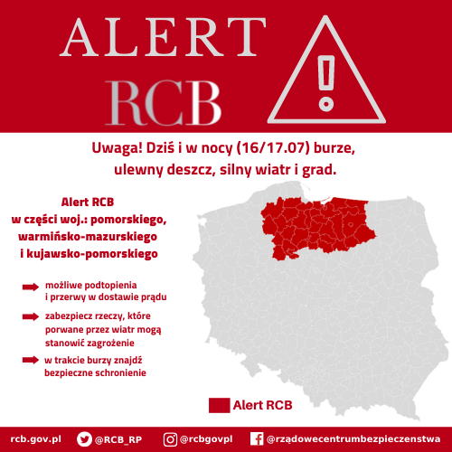 Uwaga! Dziś i w nocy (16/17.07) burze, ulewny deszcz, silny wiatr i grad. Możliwe podtopienia. Zabezpiecz rzeczy, które może porwać wiatr.