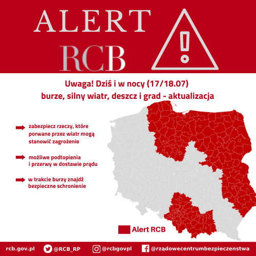"Uwaga! W nocy (17/18.07) burze, silny wiatr, deszcz i grad. Mozliwe przerwy w dostawie pradu i podtopienia. Zabezpiecz rzeczy, ktore moze porwac wiatr."