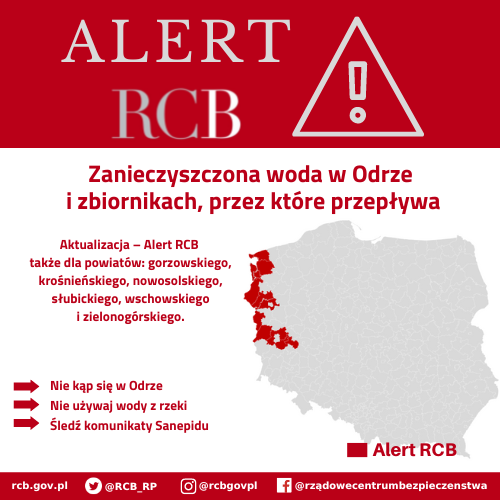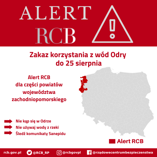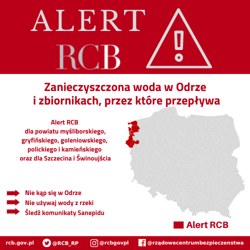 W związku z zagrożeniem ekologicznym na Odrze, do użytkowników sieci telefonii komórkowych na terenie województwa zachodniopomorskiego (powiaty: myśliborski, gryfiński, goleniowski, policki i kamieński oraz Szczecin i Świnoujście) oraz lubuskiego (gorzowskiego, krośnieńskiego, nowosolskiego, słubickiego, wschowskiego i zielonogórskiego) przesłano ALERT RCB o treści: