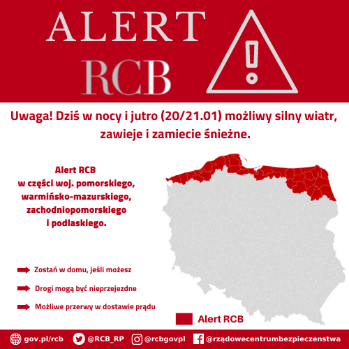 "Uwaga! Dziś w nocy i jutro (20/21.01) możliwy silny wiatr, zawieje i zamiecie śnieżne. Przygotuj się na trudne warunki na drogach i przerwy w dostawie prądu.” Alert RCB dla części województwa zachodniopomorskiego, pomorskiego i warmińsko-mazurskiego i podlaskiego.