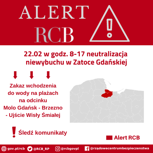 W związku z neutralizacją niewybuchów w Zatoce Gdańskiej, do odbiorców telefonów komórkowych w Gdańsku i powiecie gdańskim przesłano na ALERT RCB o treści: „Uwaga! 22.02 w godz. 8-17 neutralizacja niewybuchów. Zakaz wchodzenia do wody na plażach na odcinku: Molo Gdańsk-Brzezno-Ujście Wisły Śmiałej. Śledź komunikaty.”