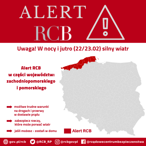 „Uwaga! W nocy i jutro (22/23.02) silny wiatr. Możliwe przerwy w dostawie prądu i trudne warunki na drogach. Zostań w domu, jeśli możesz.” Alert RCB został wysłany do nadmorskich powiatów województwa zachodniopomorskiego i pomorskiego.