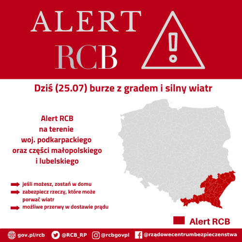 „Uwaga! Dziś (25.07) możliwe gwałtowne burze z gradem i silny wiatr. Zachowaj ostrożność i zabezpiecz rzeczy, które może porwać wiatr”. Alert RCB o takiej treści został wysłany do mieszkańców województwa podkarpackiego oraz części małopolskiego i lubelskiego. Podczas burz porywy wiatru mogą osiągać 100 km/h.